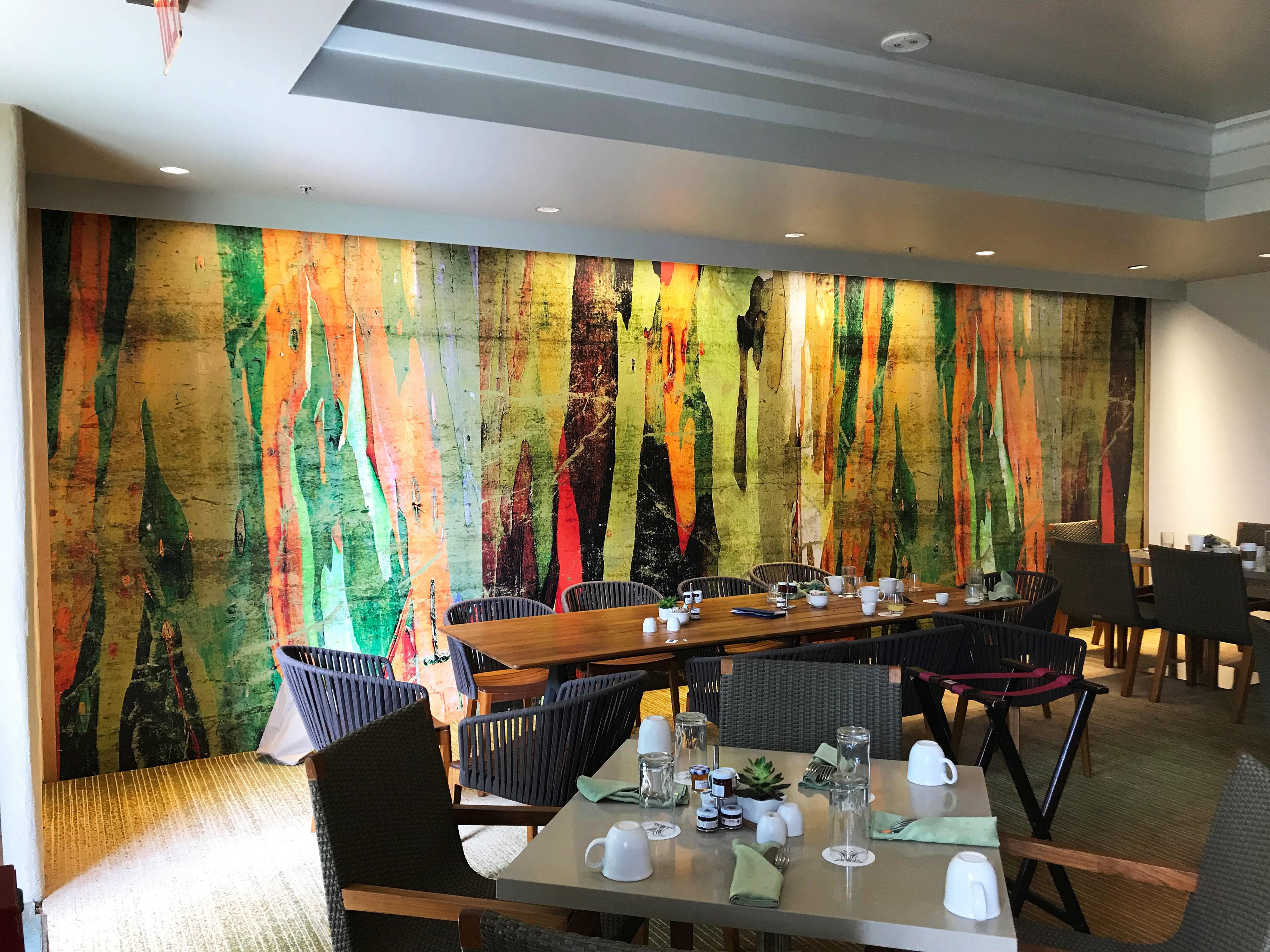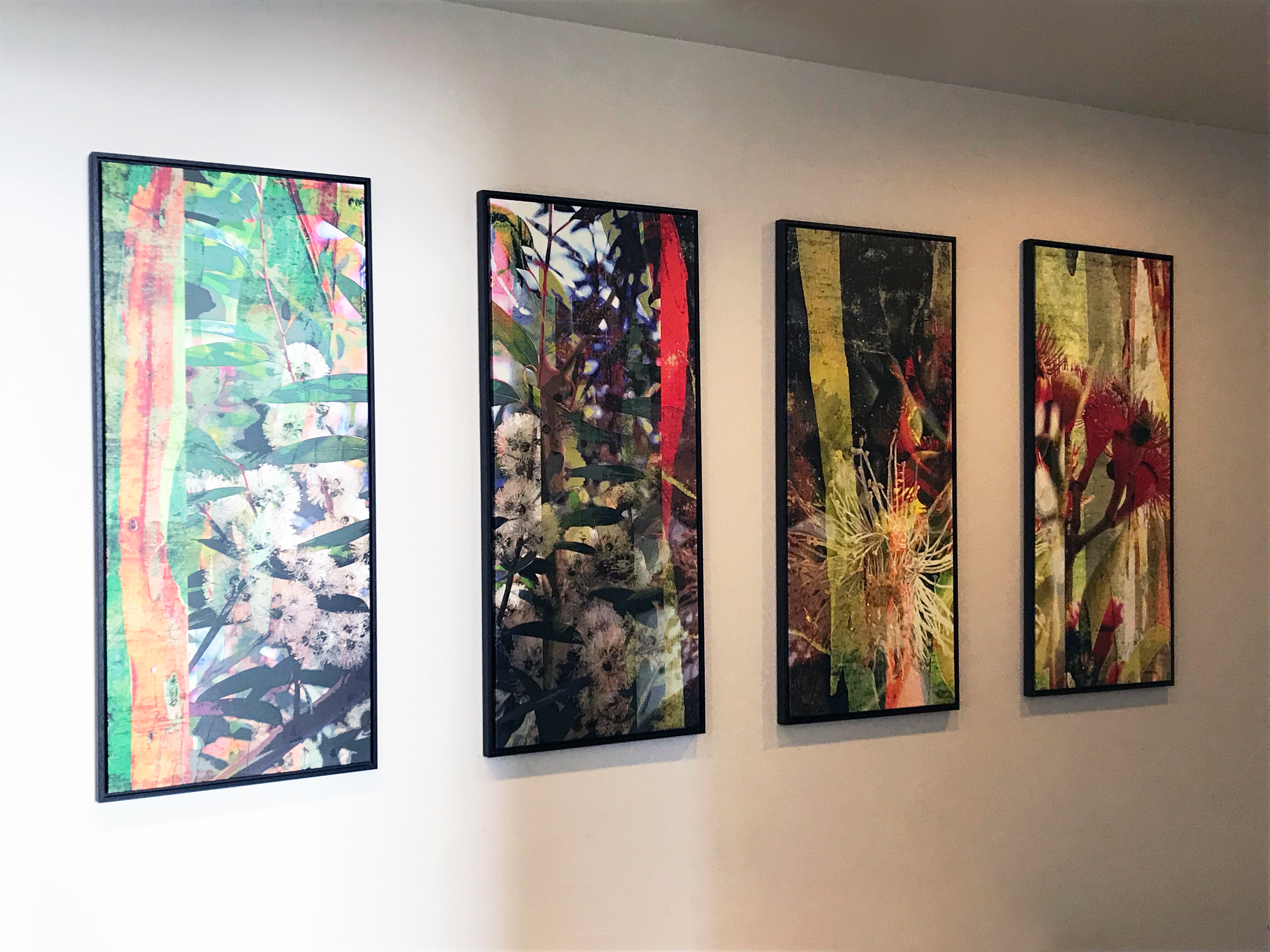 Custom design and production of framed botanical artwork and wall murals, Inspired by the Gumtree and foliage of the garden island of Kauai.