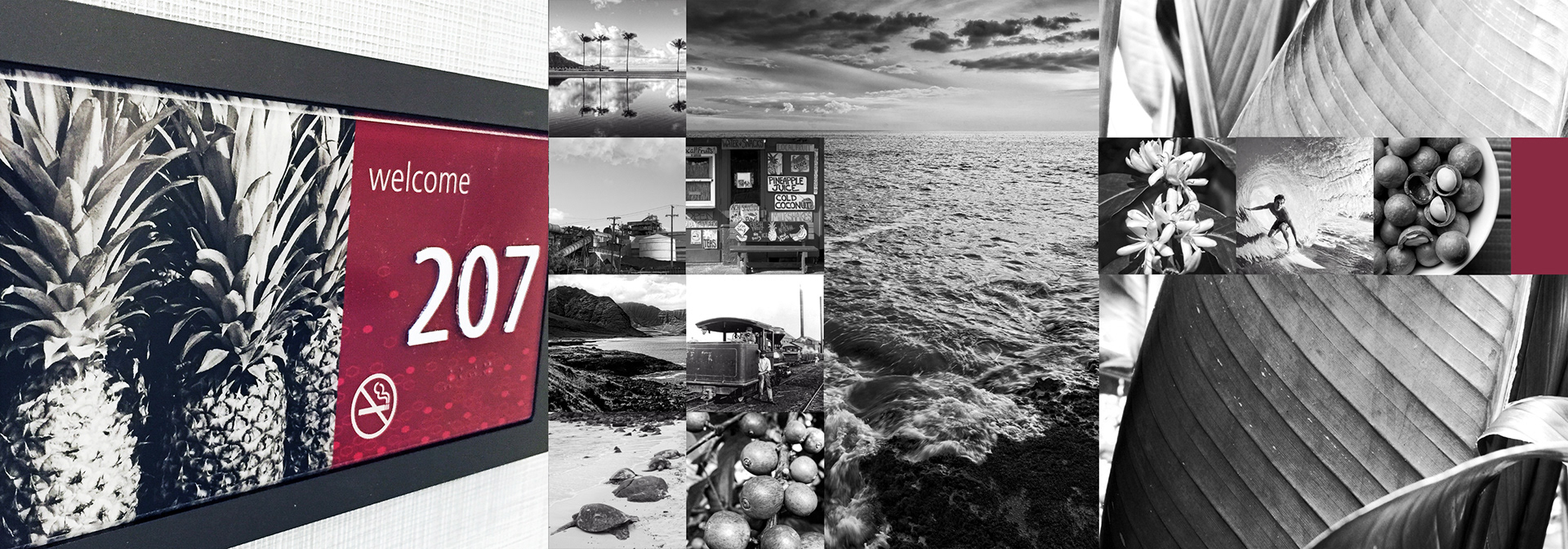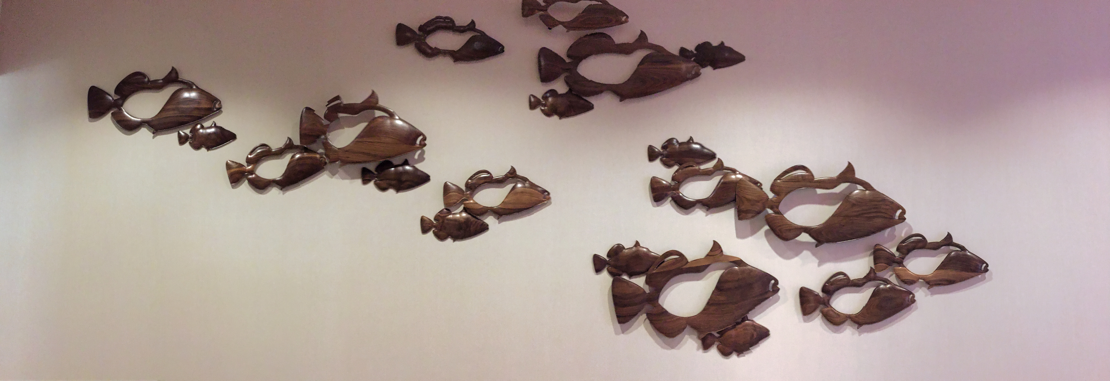 Custom Design, Production and installation of Two dimensional Lobby Walnut Wood wall sculpture of the Hawaii State fish "Humuhumunukunukuapua`a", Guest Corridor & Public Area wayfinding & signage system and custom original framed guest room artwork.